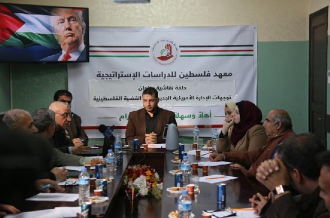 جاء ذلك خلال حلقة نقاشية نظمها معهد فلسطين للدراسات الاستراتيجية بعنوان " توجهات الإدارة الأمريكية الجديدة تجاه القضية الفلسطينية" في مقره في مدينة غزة بحضور لفيف من الأكاديميين والباحثين المختصين في الشأن الفلسطيني والدولي، بهدف تفسير السياسات الأمريكية الجديدة تجاه القضية الفلسطينية بعد فوز ترامب، ومعرفة احتمالات وتداعيات نقل السفارة الأمريكية إلى القدس، ومناقشة القرار المحتمل بإدراج الإخوان المسلمين على قائمة الإرهاب.