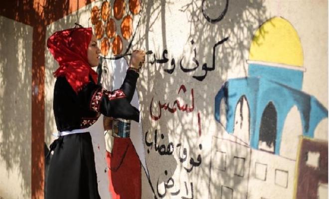 رسمت فنانة تشكيلية فلسطينية بالتعاون مع جمعية "الدراسات النسوية التنموية الفلسطينية" في قطاع غزة، اليوم الأربعاء، جدارية فنيّة، بمناسبة يوم المرأة العالمي.