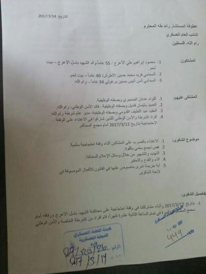 وتقدم والد الأعرج وعدد من المحامين بالشكوى للنائب العام العسكري بالضفة الغربية،وتضمنت الشكوى: الاعتداء على مشاركين في مسيرة سلمية، وفض تجمع سلمي بالقوة، إضافة للتهديد والتشهير من خلال وسائل الإعلام المختلفة، والذم والقدح والتشهير.