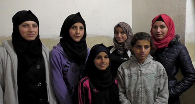 من اليمين إلى اليسار: خديجة (13)، كفاح (11)، شيرين (17)، سمر (10)، أمل (17، شاهدت الاشتباكات برفقتهنّ) وسراج (28)