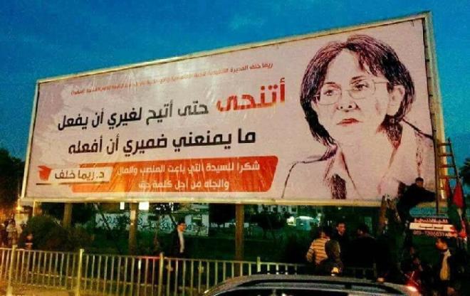وحملت اليافطة صورة خلف وكتب عليها "أتنحى حتى أتيح لغيري أن يفعل ما يمنعني ضميري أن أفعله "، كما كتب عليها أيضا "شكرا للسيدة التي باعت المنصب والمال والجاه من أجل كلمة حق".