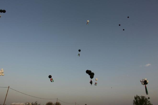 اطلق شبان فلسطينيون ، مساء السبت، عشرات البالونات التي تحمل صورللشهيدان مازن فقهاء وباسل الاعرج في سماء بلدة خزاعة الحدودية شرق مدينة خان يونس جنوب قطاع غزة.