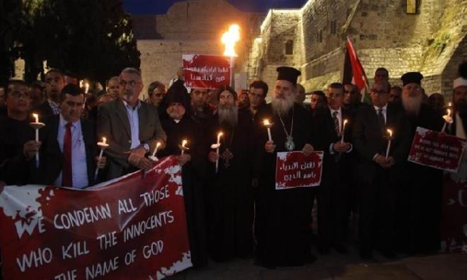 وقال المطران عطا الله حنا، لوكالة "الأناضول" التركية على هامش الوقفة: "اليوم نقف هنا من أمام كنيسة المهد المقدسة في بيت لحم مسلمين ومسيحيين لكي نرفض الإرهاب والتطرف بكل أسمائه".