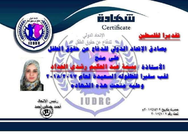 أصدر الإتحاد الدولي للدفاع عن حقوق الطفل اليوم الاربعاء قرارا بتعيين الأستاذة بسمة عبد الحكيم رشدى الحداد من قطاع غزة - فلسطين سفيرا للطفولة السعيدة وذلك عن برامجها وأعمالها المتميزة.