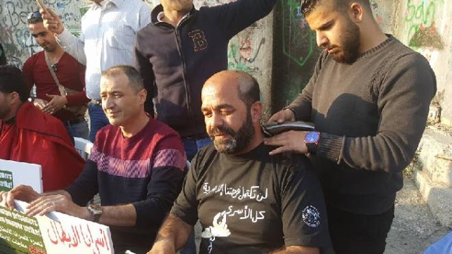 اقدم مجموعة من النشطاء الفلسطينيين على حلق شعر رؤوسهم ، مساء الاحد، تضامنا مع الاسرى في سجون الاحتلال الاسرائيلي الذين يستعدون لخوض اضراب مفتوح عن الطعام ابتداء من يوم الاثنين تحت شعار "الحرية والكرامة" .