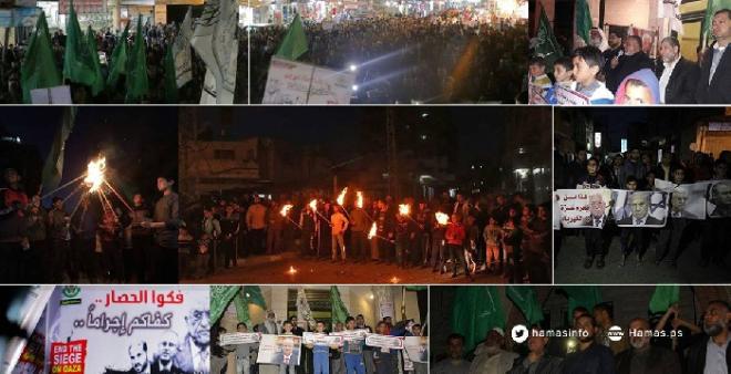 نظّمت حركة "حماس" 40 مسيرة ووقفة احتجاجية في محافظات قطاع غزة كافة؛ رفضاً للحصار، شارك فيها الآلاف من عناصر الحركة وأنصارها.