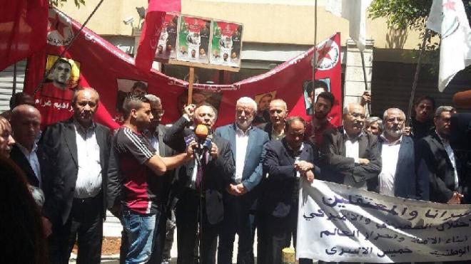 المحامي خليل بركات رئيس هيئة المحامين في تجمع اللجان والروابط الشعبية، عضو لقاء الاحزاب والقوى الوطنية قال:" اعتصامنا اليوم له اهمية خاصة، اعتصام من اجل التضامن مع الاسرى والمعتقلين في سجون العدو الصهيوني، هؤلاء قبل الاسر كانوا يقاومون العدو بالسلاح، واليوم يقاومونه بامعائهم الخاوية هي معركة واحدة بوجه العدو الصهيوني، هي معركة واحدة لامتنا نخوضها وفي طليعتهم الاسرى المنتفضون هناك في سجون العدو الصهيوني، هؤلاء يسطرون بموقفهم مواقف خالدة يجب ان تكون حافزا لنا ولجميع احرار هذه الأمة ولجميع الاحزاب والقوى في هذه الأمة، بان فلسطين هي الاساس وان فلسطين هي القضية وفلسطين يجب ان تتجه اليها البوصلة في كل موقف وكل نضال. لقد اعتقد الاعداء ان الفتن التي يدبرونها في الاقطار العربية من مذهبية وطائفية وفتن التدمير والقتل من شأنها ان تغض النظر عن قضية فلسطين وها هم الاسرى استطاعوا ان يعيدوا توجيه البوصلة على فلسطين وان فلسطين ستبقى في الوجدان والضمير، ويجب ان تكون اضافة الاسرى حافزا ولكل شعبنا العربي من اجل الوحدة العربية، لأن هذه الوحدة هي التي تحمي فلسطين."