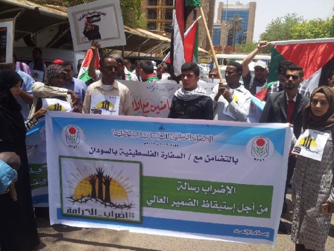 يذكر أن المعتصمون شكلوا جداراً بشرياً، وهم يرفعون والأعلام الفلسطينية والسودانية، وصور وشعارات تضامنية مع إضراب الأسرى.