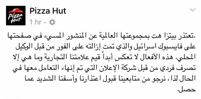 اعتذرت شركة "بيتزا هت" العالمية عن منشور اعتبر مسيئا للأسرى الفلسطينيين نشر على صفحتها في فيسبوك إسرائيل.