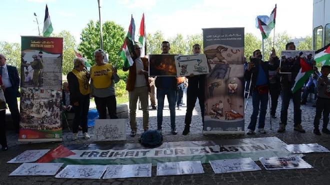 وتجمع المتظاهرون أمام مكتب الأمم المتحدة في فيننا، رافعين الأعلام الفلسطينية، ولافتات كتبت عليها عبارات داعمة لفلسطين من قبيل "الحرية لغزة"، و"فلسطين حرة".