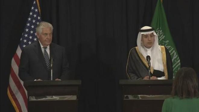 وأضاف في مؤتمر صحافي مع وزير الخارجية الأميركي ريكس تيلرسون عقب لقاء قمة بين خادم الحرمين الملك سلمان بن عبدالعزيز آل سعود والرئيس الأميركي أن توقيع اتفاقيات استراتيجية بين واشنطن وللرياض "يتصدى للإرهاب في المنطقة".