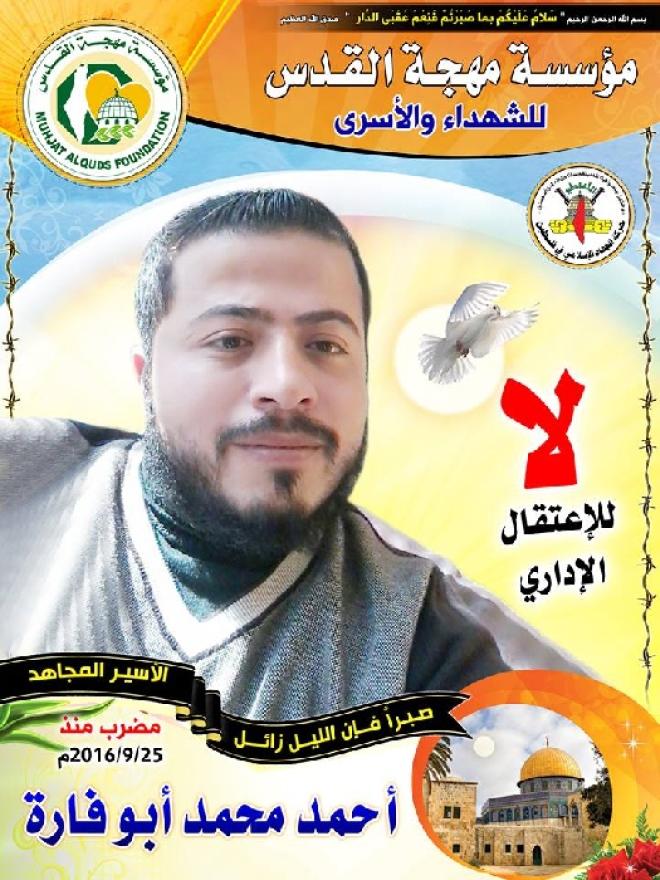جدير بالذكر أن الأسير أحمد أبو فارة ولد بتاريخ 08/11/1987م، وهو متزوج، وسبق أن اعتقل في سجون الاحتلال الصهيوني على خلفية عضويته ونشاطه في صفوف حركة الجهاد الإسلامي، وأفرج عنه من سجن النقب.