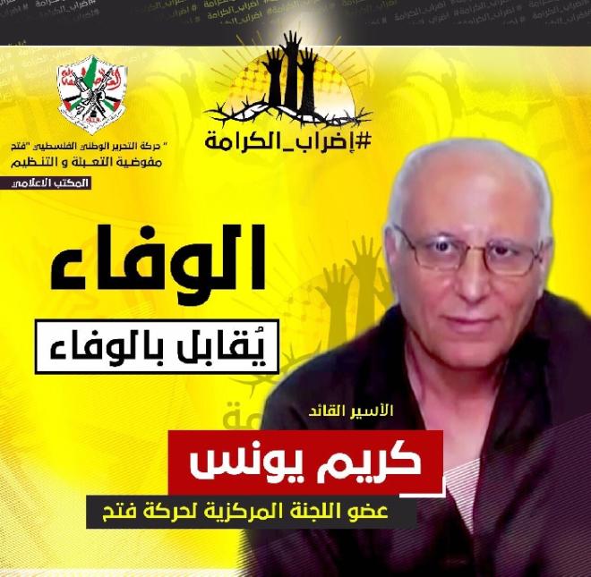 قال رئيس هيئة شؤون الأسرى والمحررين عيسى قراقع، ورئيس نادي الأسير الفلسطيني قدورة فارس، إن اتخاذ المجلس الثوري لحركة فتح، قراراً بالمصادقة على تعيين عميد الأسرى الفلسطينيين كريم يونس عضواً في اللجنة المركزية لحركة فتح؛ هي خطوة هامة وذات دلالات كبيرة، في الوقت الذي يخوض فيه الأسير يونس المعتقل منذ 35 عاماً إضراباً مفتوحاً عن الطعام بجانب رفاقه الأسرى والمستمر منذ (41) يوماً.