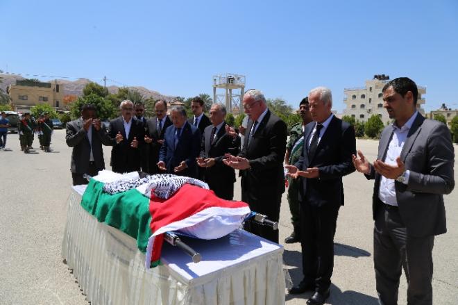وكان الجثمان قد وصل ظهر اليوم لمقر محافظ أريحا والأغوار وسط مدينة أريحا، حيث سجي على مكان مخصص لإلقاء النظرة الأخيرة عليه من قبل الحضور.