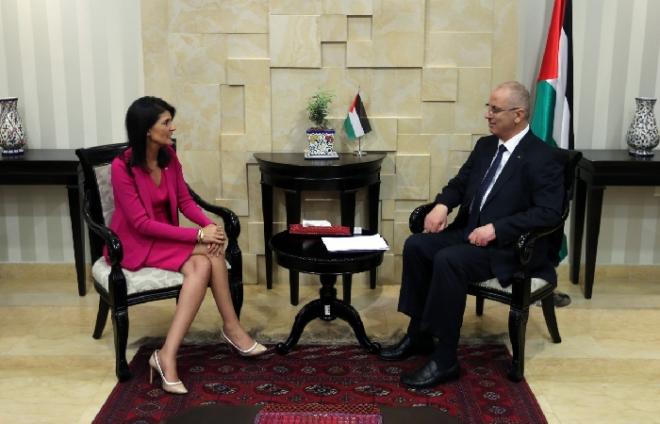 بحث رئيس الوزراء الفلسطيني رامي الحمد الله، اليوم الأربعاء في مكتبه برام الله، مع سفيرة الولايات المتحدة الامريكية في الامم المتحدة نيكي هيلي، آخر التطورات السياسية والاقتصادية، بحضور القنصل الامريكي العام في القدس دونالد بلوم.