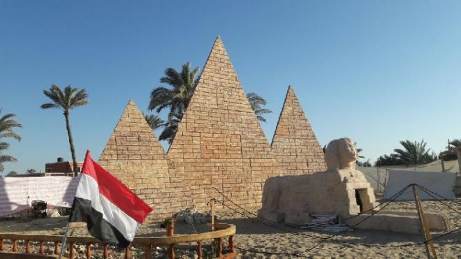 وشيد القائمون تمثال "أبو الهول" من الخراسان، والأهرام الثلاث من "الخشب ومادة الفلين"، طُليت بدهان يُشابه الحجارة التي بُنيت منها، فيما دُشنت بقية المعالم من أنواع الخشب المُختلفة؛ بينما أطلق على مسالك وممار المقهى أسماء شوارع مصرية مشهورة "كالمُعز، شهاب"..