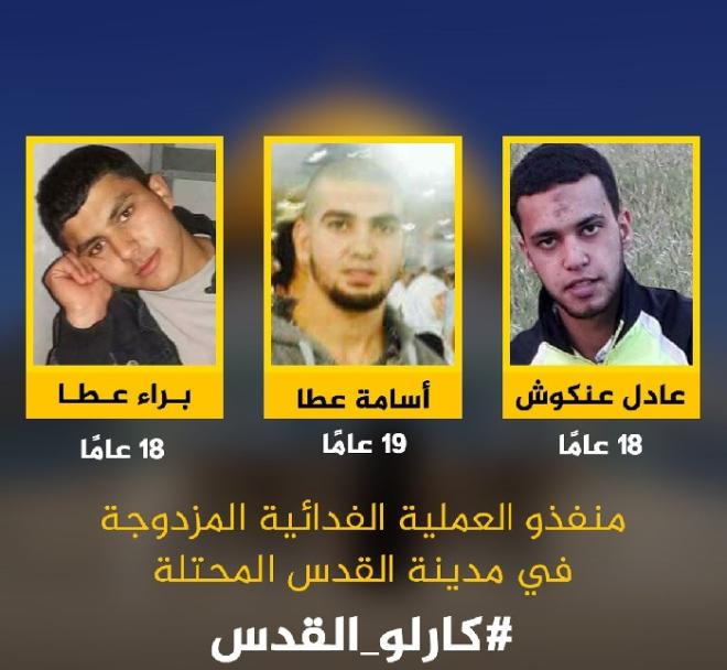 العديد من النشطاء على شبكات التواصل الإجتماعى اطلقوا هاشتاغ #كارلو_القدس على #عملية_القدس الفدائية في #باب_العامود معبرين وفق ما رصده تقرير "وكالة قدس نت للأنباء" ، عن فرحة كبيرة بهذه العملية التي أدت إلى ارتقاء الشهداء الثلاث وهم الشهيد "براء صالح 18 عاماً" من دير أبو مشعل و الشهيد "عادل عنكوش 18 عاماً" من البيرة والشهيد "عامر بدوي 31 عاماً" من الخليل، ومقتل المجندة "هداس مولخو 23 عاما"، مؤكدين أن منفذي العملية ليس لهم علاقة بداعش بل ينتمون لحماس والجبهة الشعبية لتحرير فلسطين.