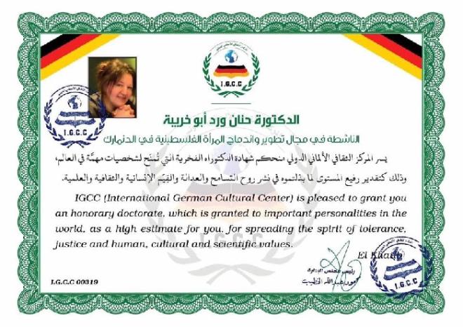 وأضاف الاتحاد في بيان اطلعت على نصه "وكالة قدس نت للأنباء" أن "منح امين سر المرأة الفلسطينية بالاتحاد في الدنمارك حنان ورد شهادة الدكتورة الفخرية تقدير لجهدها المتميز والدؤوب في خدمة الثقافة العربية والقضايا الانسانية ومد الجسور بين المجتمعات الشرقية والغربية، بالإضافة الى نشاطها السياسي في الدنمارك ودورها الذي يشهد لها الجميع في منظمات المجتمع المدني هو خير مثال على عطاء المرأة الفلسطينية المستمر وارداتها الصلبة ."