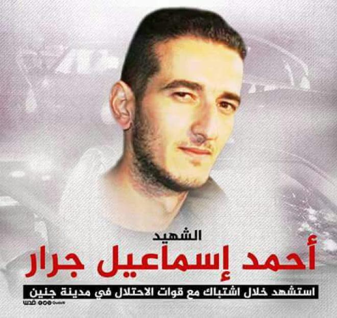 وذكرت المصادر إن العملية العسكرية الإسرائيلية في جنين، أسفرت عن استشهاد أحمد إسماعيل محمد جرار (٣١ عاماً) ، بعدما حاصرت قوات خاصة إسرائيلية منزله في منطقة واد برقين غرب جنين واستهدفته بالرصاص.