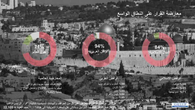 واظهر الاستطلاع، الذي نشرته صحيفة "الغد" الأردنية، أن أكثر من ثلثي العالم معارض للقرار (بنسبة 71 %)، وان 59 % منهم معارضين بشدة. بينما وصلت نسبة المعارضة للقرار في الوطن العربي وحده إلى 94 %، ووصلت في الأردن إلى 97 %. اما على مستوى الدول الإسلامية فبلغت 84 %.