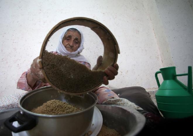 المسنة فاطمة محمد درويش ( 84 عاما ) تعد عجين المفتول في منزلها في قرية جماعين جنوب نابلس، والذي يعتبر واحداً من الأطباق الفلسطينية التي تعد على نطاق واسع خاصة في فصل الشتاء.