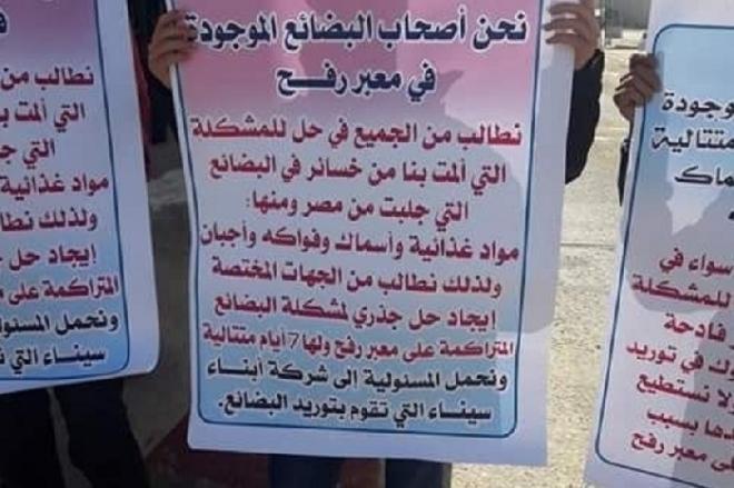 احتج نحو 50 تاجرًا من تجار القطاع، مساء الأربعاء أمام بوابة معبر رفح البري رفضًا لمنع الهيئة العامة للمعابر والحدود في السلطة الفلسطينية دخول بضائعهم عبر المعبر منذ أيام، الأمر الذي أدى لتلف بعضها.