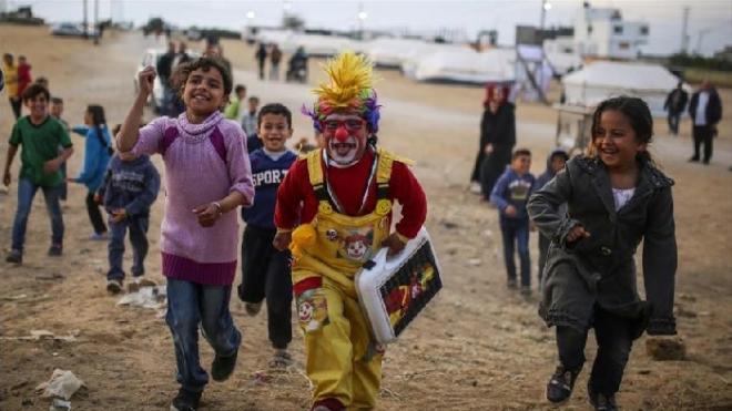 مقداد، صاحب الابتسامة العريضة، والأنف الأحمر، رصدته عدسة وكالة "الأناضول" التركية، التي تتواجد في المكان، وكان حديثه، "مجيئي للمناطق الحدودية كان واجب علي كوني أتمتع بمهارات عالية لإضحاك الناس".