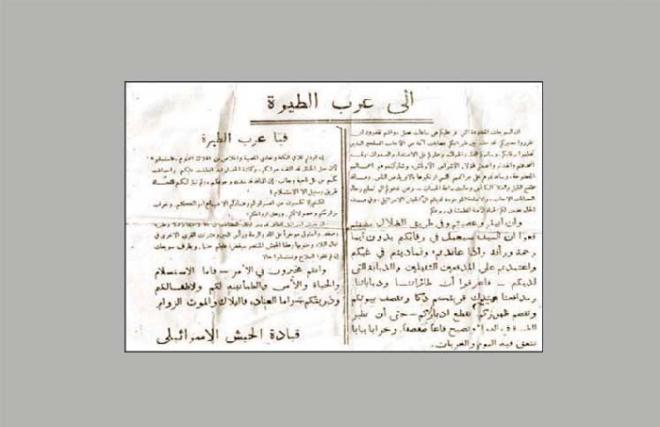 ويخاطب الجيش الإسرائيلي أهالي الطيرة التي كانت وقتها جزءا من منطقة المثلث الكبير الذي حازت عليه إسرائيل من الأردن في اتفاقية رودوس عام 1949 :" إن أردتم تلافي النكبة وتفادي المصيبة والخلاص من الهلاك المحتوم، فاستسلموا لأن حبل الخناق قد التف حولكم، وكماشة الحصار قد انطبقت عليكم وأحاطت بكم من كل ناحية وجانب. إن المنافذ قد سدت بوجوهكم، ولم يبق لكم للنجاة طريق وسبيل إلا الاستسلام.