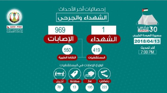 واوضح القدرة بان " 419 اصابة وصلت لمستشفيات قطاع غزة و 550 اصابة تعاملت معها النقاط الطبية، المنتشرة على طول السياج الحدودي شرق القطاع ، ومن بينها 15 اصابة خطيرة و 58 متوسطة و 213 طفيفة.