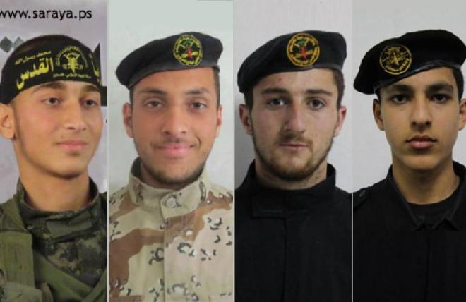 وقالت سرايا القدس في بيان عسكري تلقت "وكالة قدس نت للأنباء" نسخة عنه أن الشهداء هم :" أمجد حسني القطروس "18 عاماً"، عائد صالح الحمايدة "23 عاماً"، هشام محمد عبد العال "22 عاماً"، هاشم عبد الفتاح كلاب "18 عاما" وجميعهم من لواء رفح.
