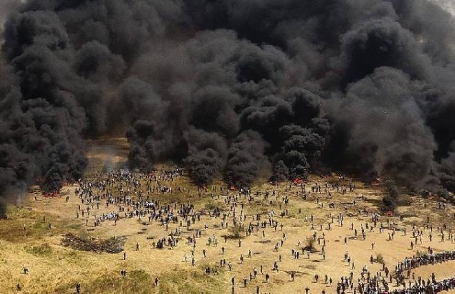 الكاتب أورد بعض هذه المشاهد التي تزخر بها مسيرات غزة الأخيرة، ويعتبرها الفلسطينيون سلاحا قويا لهم، ومنها سيدة تحمل علما أمام الجدار الحدودي سرعان ما تسقط بنيران إسرائيلية، أو فتى صغيرا يتلقى عيارا ناريا في الرأس من جنود يقفون قبالته وهم مدججون بالسلاح، وعشرات الدبابات التي تستعد لمواجهة فتيان فلسطينيين صغار يهمون بإحراق إطارات سيارات.