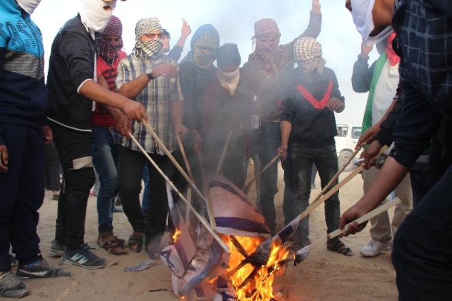 متظاهرون يحرقون العلم (الإسرائيلي) بمخيم العودة شرق مدينة غزة ضمن فعاليات #مسيرة_العودة_الكبرى وفي يوم الأسير الفلسطيني