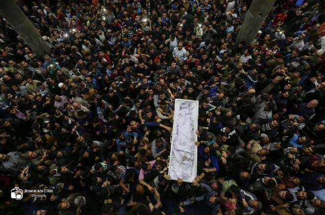 شيع آلاف الفلسطينيين، مساء الخميس، جثمان الشهيد العالم فادي البطش في موكب جنائزي مهيب ببلدة جباليا شمال قطاع غزة .