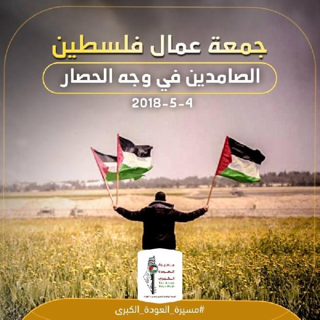 وبدأت اللجنة بنشر صور خاصة بهذه الجمعة على صفحتها على مواقع التواصل الاجتماعي، تدعو جميعها إلى ضرورة "الحشد الشعبي" يوم الجمعة المقبل. وكتبت اللجنة على الكثير من صور المواجهات الشعبية التي اندلعت في أيام الجمع الماضية، والتي انطلق أولها يوم 30 آذار/ مارس الماضي، "جمعة عمال فلسطين الصامدين في وجه الحصار".