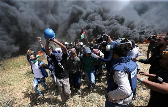 أصيب ثلاثة مواطنين فلسطينيين برصاص قوات جيش الاحتلال الإسرائيلي أثناء مشاركتهم بفعاليات مسيرة العودة الكبرى شرق بلدة خزاعة بمدينة خان يونس جنوب قطاع غزة