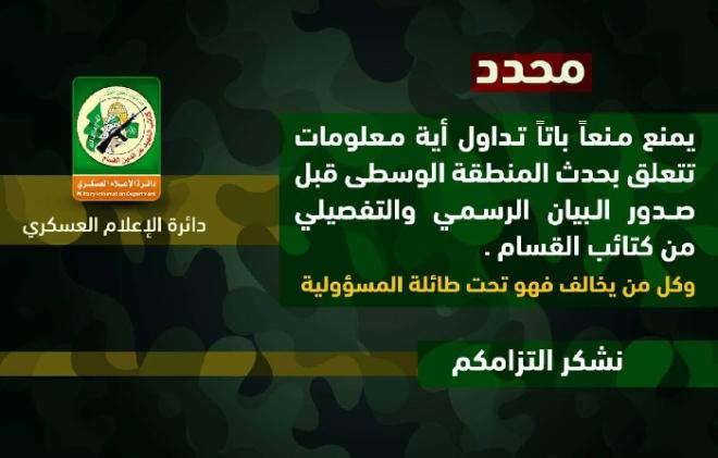 وقالت الكتائب في بيان عسكري، "يمنع منعا باتاً تداول أية معلومات تتعلق بحدث المنطقة الوسطى قبل صدور البيان الرسمي والتفصيلي من كتائب القسام".