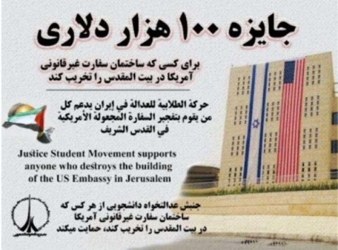 وفي المنشور الوارد الذي باللغات العربية والانجليزية والفارسية، أن "الحركة الطلابية للعدالة تدعم كل من يتمكن من تفجير السفارة الأميركية في القدس التي وصفوها بغير القانونية". وأضاف الخبر أن "نقل السفارة الأميركية الى القدس أدى الى غضب وكره المسلمين والاحرار في العالم"