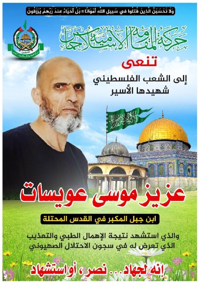 نعت حركة "حماس" إلى الشعب الفلسطيني الأسير عزيز عويسات من مدينة القدس، الذي استشهد داخل سجون الاحتلال الإسرائيلي، بعد عزله وتعذيبه وتعمد إهمال علاجه حتى الموت، معتبرة ذلك "جريمة جديدة تضاف إلى سجل الاحتلال الأسود وجرائمه وانتهاكاته بحق شعبنا الفلسطيني وأسرانا البواسل."