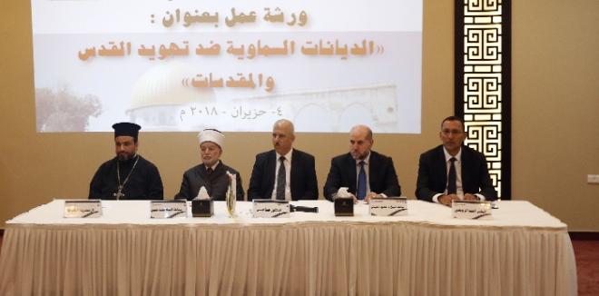 جاء ذلك خلال ورشة  عمل حملت عنوان "الديانات السماوية ضد تهويد القدس  ومقدساتها" عقدتها الهيئة الاسلامية المسيحية لنصرة القدس والمقدسات،  بالتعاون مع مكتب تمثيل منظمة التعاون الاسلامي لدى دولة فلسطين، بحضور عدد من الشخصيات الاعتبارية والسفراء ورجال الدين .