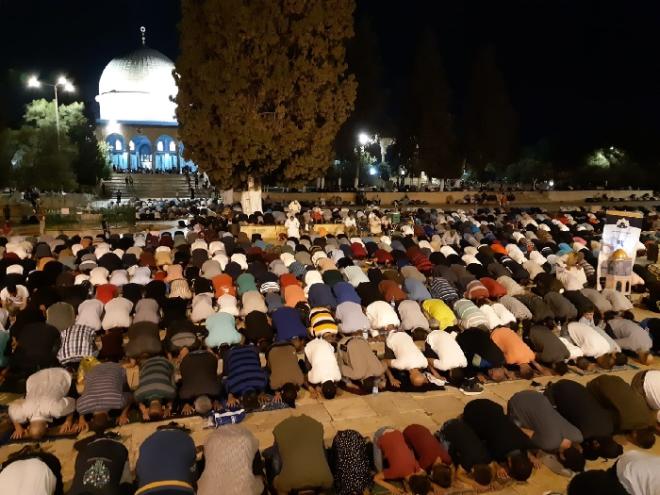 شارك آلاف المواطنين  الفلسطينيين من القدس وأراضي الـ48 ومدن الضفة الغربية، بصلاتي العشاء وقيام الليل "التراويح" في رحاب المسجد الأقصى المبارك.
