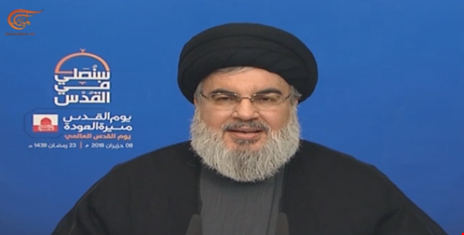 وفي كلمة له بمناسبة يوم القدس العالمي، رأى نصر الله أن مناسبة إحياء يوم القدس التي أطلقها الإمام الخميني تؤكد اليوم أنها حية بقوة في الضمائر، مضيفاً أن مدينة القدس اليوم هي أمام تحديات ثلاثة، أولها معركة ألا تعترف دول العالم بالقدس عاصمة لإسرائيل وألا يستسلموا للقرار الأميركي، وثانيها يتعلّق بالديمغرافيا وتغيير الهودية السكانية للمدينة المقدسة، أما ثالثها فهو يتعلّق بالمقدسات، مضيفاً أن الرّهان هنا على المسلمين والمسيحيين في المدينة.