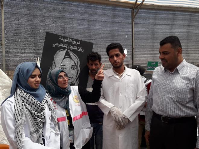 والدة الشهيدة المسعفة رزان النجار تلبس معطف ابنتها الابيض و بطاقتها الطبية لتكمل مشوارها الانساني الصحي انطلاقاً من النقطة الطبية لوزارة الصحة (نقطة رزان النجار الطبية ) شرق خان يونس جنوب قطاع غزة