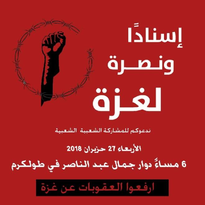 دعت حملة "ارفعوا العقوبات" عن قطاع غزة، للمشاركة الشعبية الواسعة، في مظاهرة بمدينة طولكرم، وذلك يوم غد الأربعاء الساعة الـ6 مساءً على دوار جمال عبد الناصر.