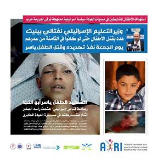 وتأتي جريمة الاستهداف العمدي للطفل أبو النجا في ظل تحريض قيادات الاحتلال ضد التجمعات السلمية التي يقيمها المدنيون على طول السلك الفاصل مع قطاع غزة، سيما تصريحات وزير التعليم في حكومة الاحتلال التي دعا فيها لقتل الأطفال حتى لو كانوا دون الثامنة من العمر، الأمر الذي يعكس استهتار قوات الاحتلال بقواعد القانون الدولي الإنساني، ويدلل على عنصريتها ومناهضتها للحق في التجمع السلمي المكفول بموجب المواثيق الدولية.