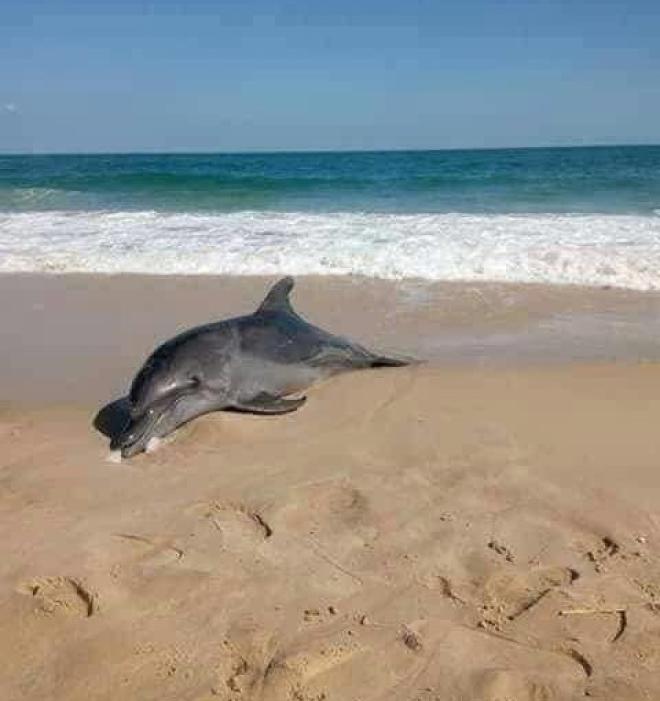 ظهر دلفين نافق على شاطئ مدينة رفح الفلسطينية في ظاهرة فريدة من نوعها أسبابها غير واضحة المعالم.