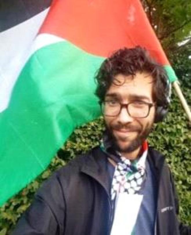 والناشط لادرا الذي يبلع من العمر (25 عاما) قطع رحلته وهو يحمل علما فلسطينيا على ظهره ويضع الكوفية الفلسطينية على كتفيه.