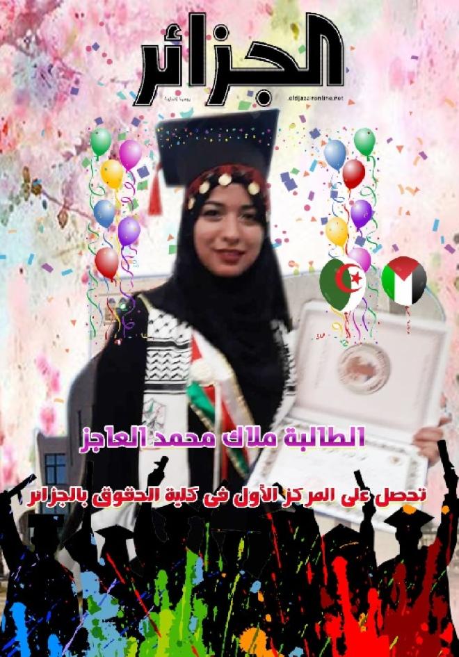 في لقاء مع جريدة "الجزائر" قدمت ملاك العاجز المتفوقة و بجدارة و استحقاق على المرتبة الأولى في الدفعة الأجنبية بكلية الحقوق الجزائرية قسم القانون الخاص، قدمت تفاصيل نجاحها الذي أهدته إلى كل الشعب الفلسطيني، وقالت الطالبة أن نجاحها بمثابة تكريم لكل أبناء الجالية الفلسطينية ولطلابها في الجامعات الجزائرية، وبدورها تلقت ملاك العاجز التهاني من حركة التحرير الوطنى الفلسطينى "فتح" بإقليم الجزائر، على تفوقها بشهادة الليسانس كلية الحقوق قسم القانون الخاص من جامعة الجزائر (1)"بن يوسف بن خدة" و تكريمها من طرف وزير التعليم العالي الجزائري وتمثيل بلدها فلسطين أحسن تمثيل لما قدمته طيلة مسارها الدراسي منذ قدومها إلى الجزائر وعزمت أن تكون سفيرة لبلدها مستقبلا أينما حلت بتفوقها ونجاحها و طموحها وأن تكون طرفا فاعلا في تغيير مسار بلادها و لو بالشيء القليل.