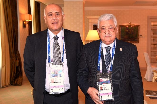 ورافق أبو مازن في زيارته إلى روسيا، رئيس الاتحاد الفلسطيني لكرة القدم اللواء جبريل الرجوب.