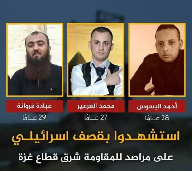 وأفاد الناطق باسم وزارة الصحة الفلسطينية في قطاع غزة اشرف القدرة، باستشهاد 3 مواطنين وإصابة رابع بجراح بليغة في قصف إسرائيلي استهدف مجموعة من الشبان شرق مدينة غزة ، نقلوا جميعا إلى مجمع الشفاء الطبي غرب المدينة، والشهداء هم: احمد منير سليمان البسوس( 28 عام) عبادة اسعد خضر فروانة (29 عام)، محمد توفيق محمد العرعير( 27 عام).
