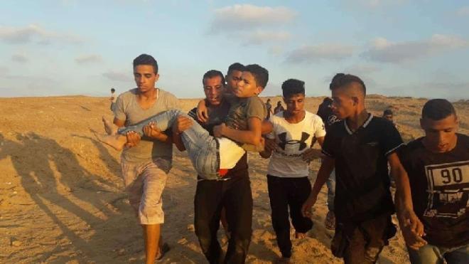 وافادت مصادر محلية وطبية بان قوات الاحتلال اطلقت النار باتجاه الفتية المتواجدين بمخيم العودة شرق غزة ، ما ادى الى اصابة طفل بمنطقة الرأس بشظايا رصاص الاحتلال، ونقل على اثر ذلك الى المستشفى لتلقي العلاج، حيث وصفت جراحه بالطفيفة..
